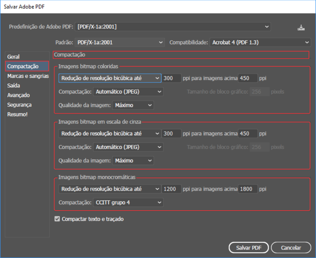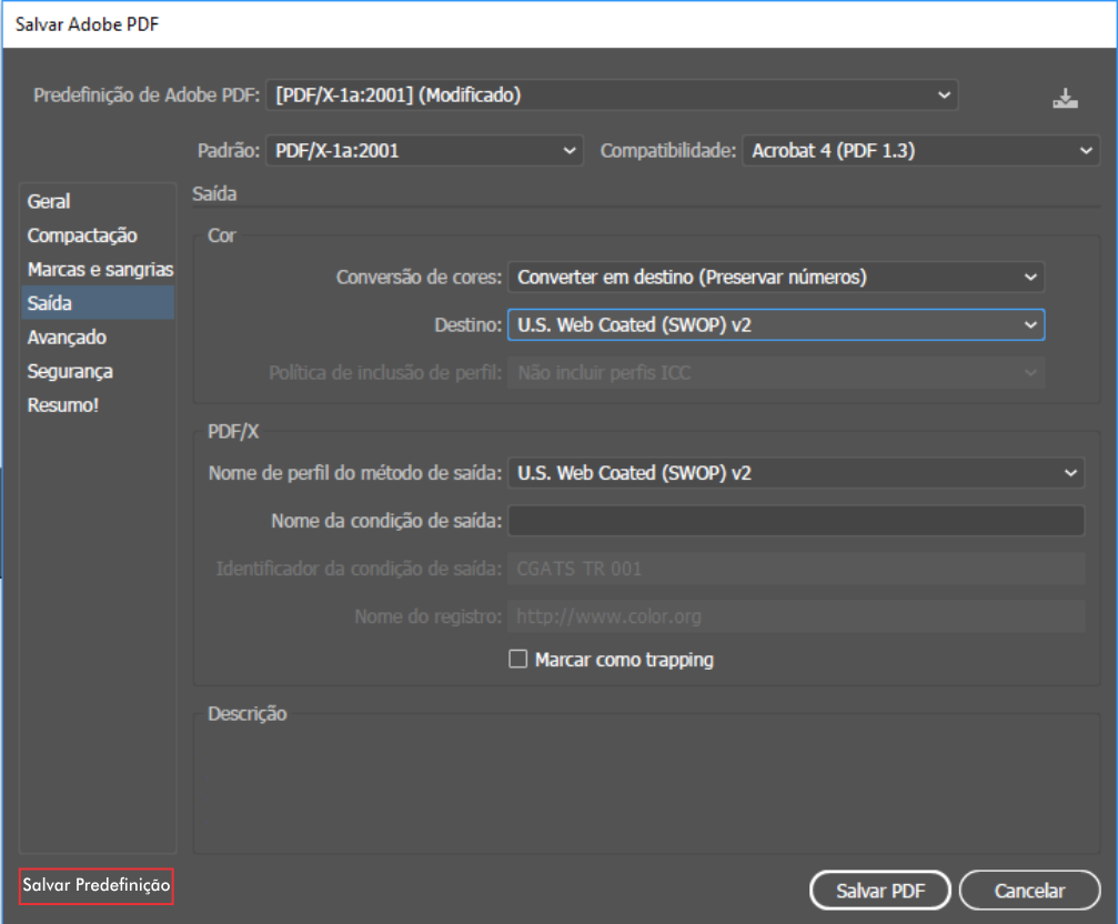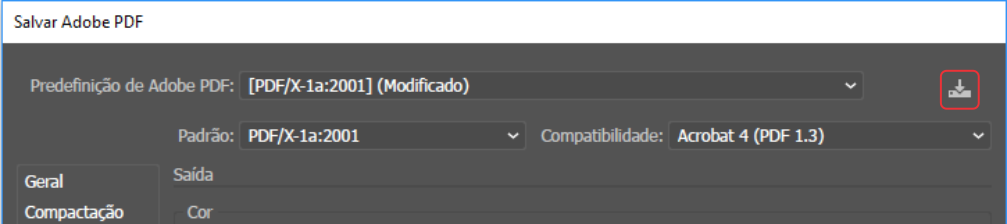 Na próxima janela que se abrir, configure o campo: "Predefinição de Adobe PDF" para "PDF/X-1a:2001".