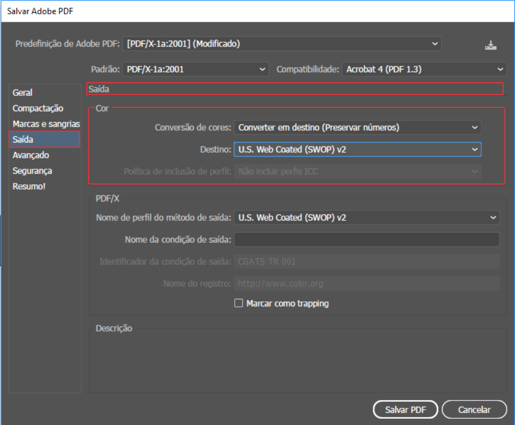 Na Aba Saída, em "Cor" selecione em "Destino" a opção: "U.S. Web Coated (SWOP) v2"